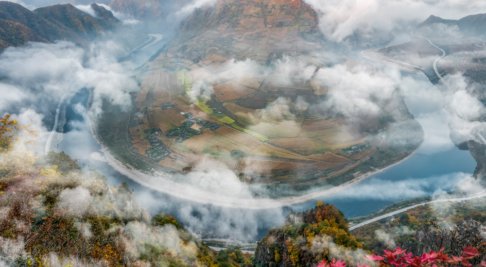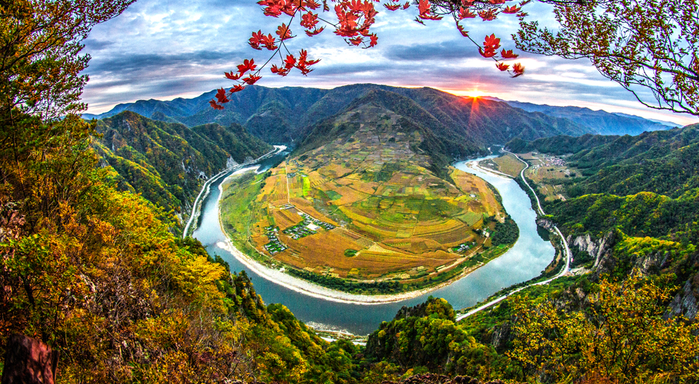 鸭绿江神龟岛位于中朝边境鸭绿江畔,是鸭绿江自然水道形成的回水湾,因山水之形酷似神龟望月而得名。从鸭绿江铁花山上眺望,鸭绿江水绕山缓行,山水相融,山依水,水傍山,景色壮观,气势磅礴。