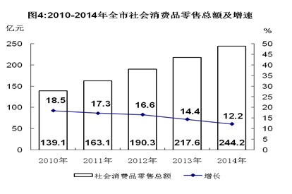 市场销售稳定增长。全年实现社会消费品零售总额244.2亿元,比上年增长12.2%。其中,全市实现城镇消费品零售额214.6亿元,增长12.5%,占社会消费品零售总额的87.8%;乡村实现零售额29.6亿元,增长9.8%,增速比上年下降6.4个百分点。住宿和餐饮业实现零售额50.5亿元,分别增长7.7%和15.0%。