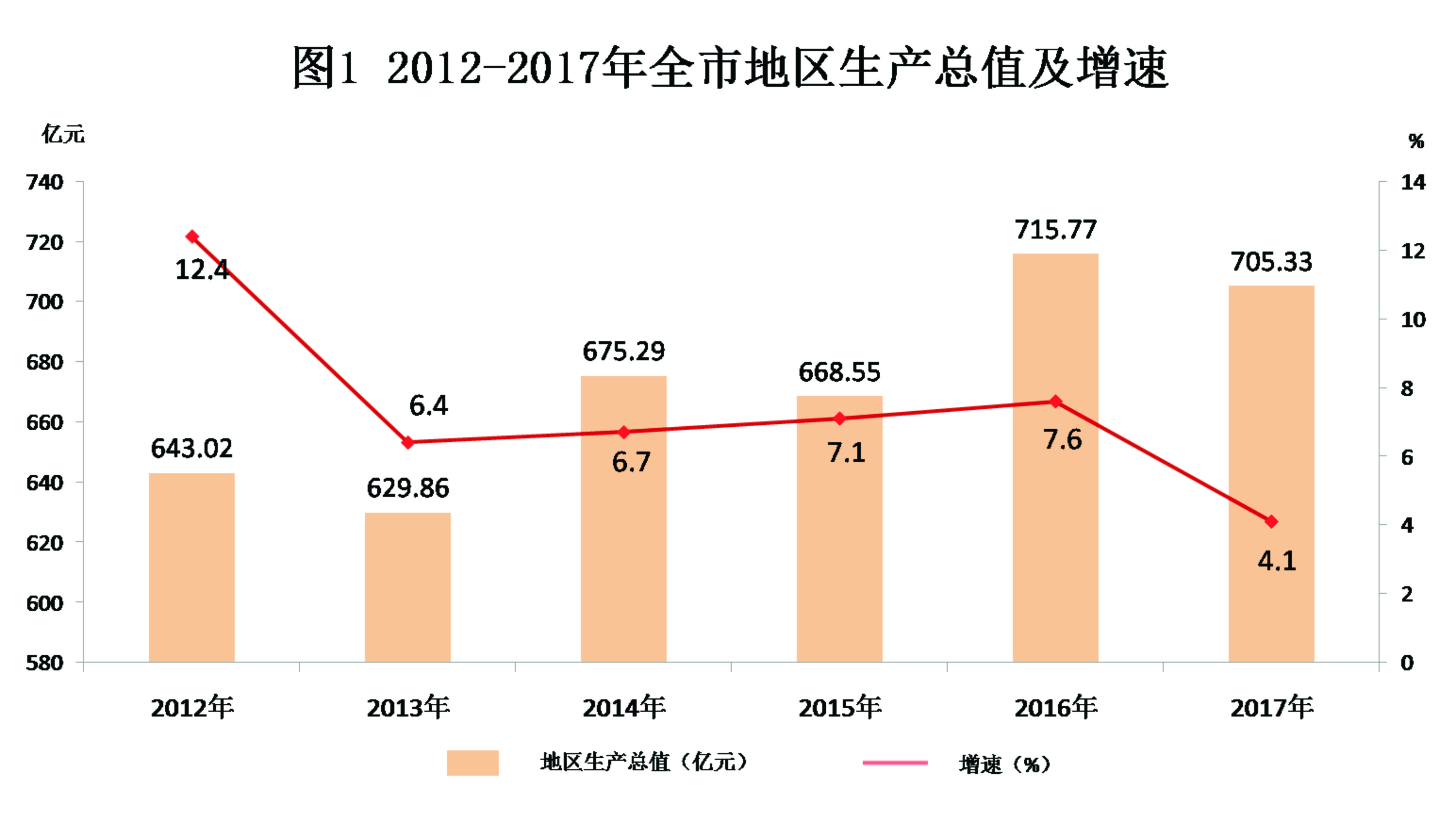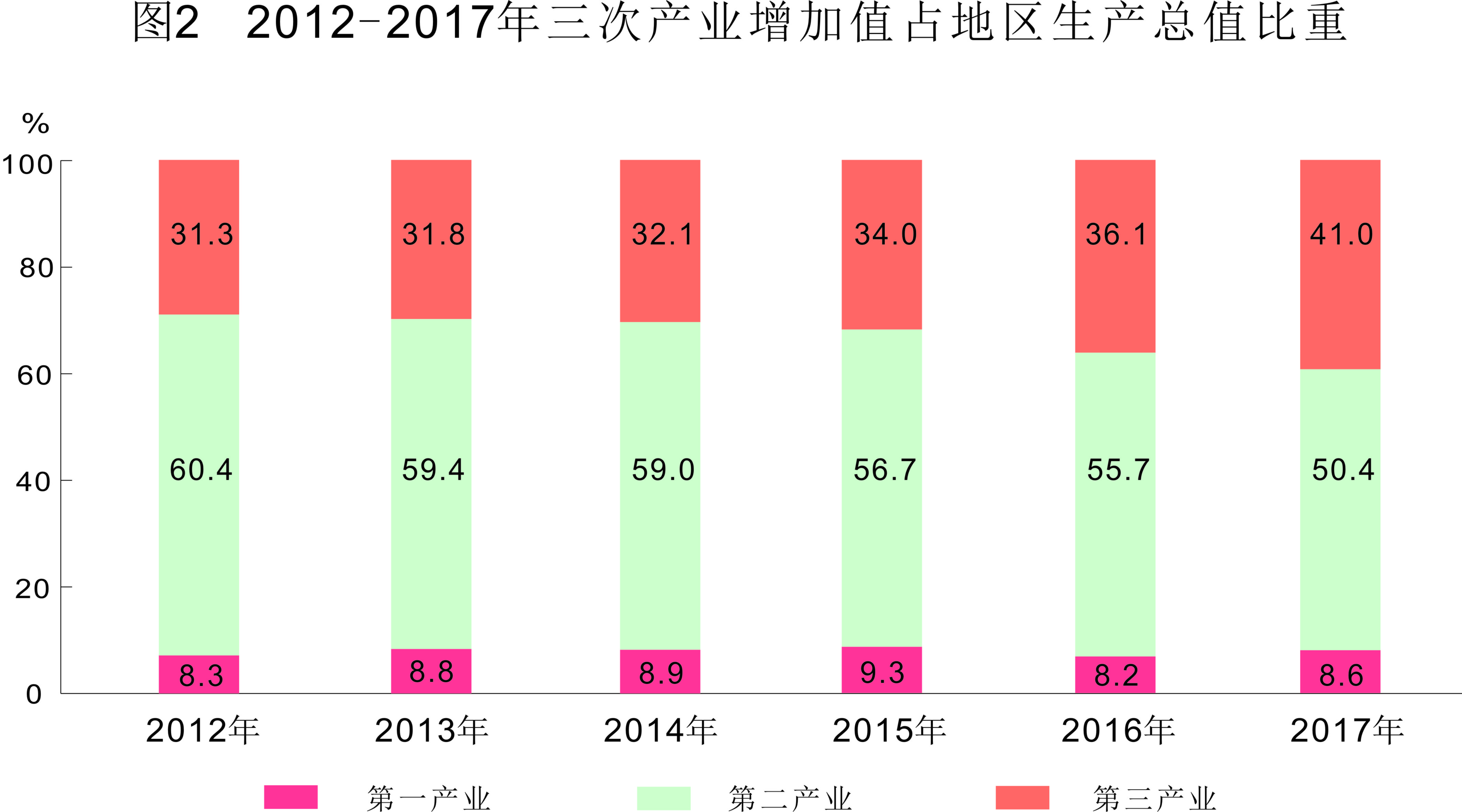初步核算,全年实现地区生产总值705.33亿元,比上年增长4.1%。其中,第一产业增加值60.36亿元,增长3.6%;第二产业增加值355.20亿元,下降0.8%;第三产业增加值289.77亿元,增长12.0%。第一产业增加值占生产总值的比重为8.6%,第二产业增加值比重为50.4%,第三产业增加值比重为41.0%。全年人均生产总值58503元。