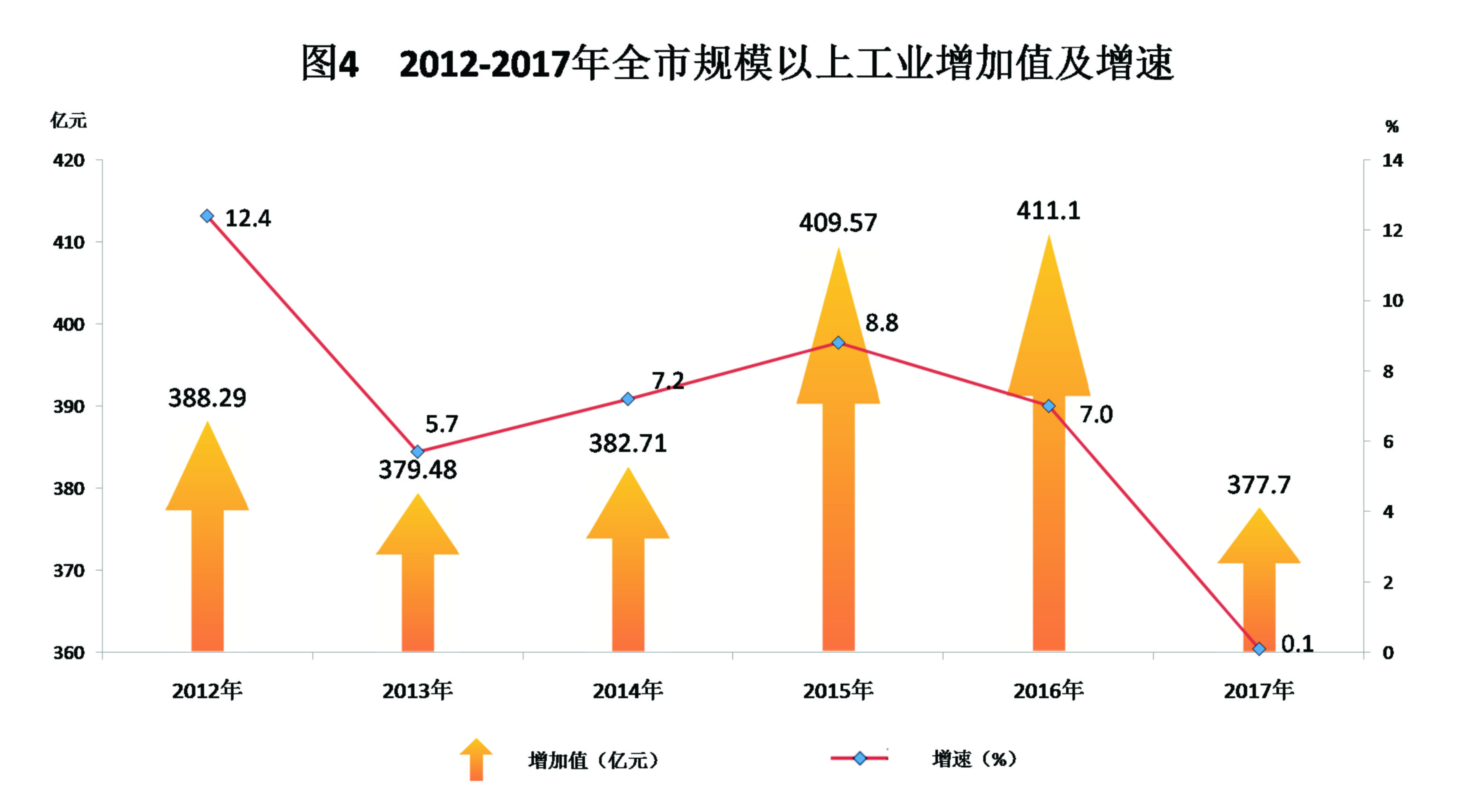 工业生产稳定增长。全市367户规模以上工业企业实现增加值377.65亿元,按可比价计算,比上年增长0.1%;实现主营业务收入1333.77亿元,下降1.8%