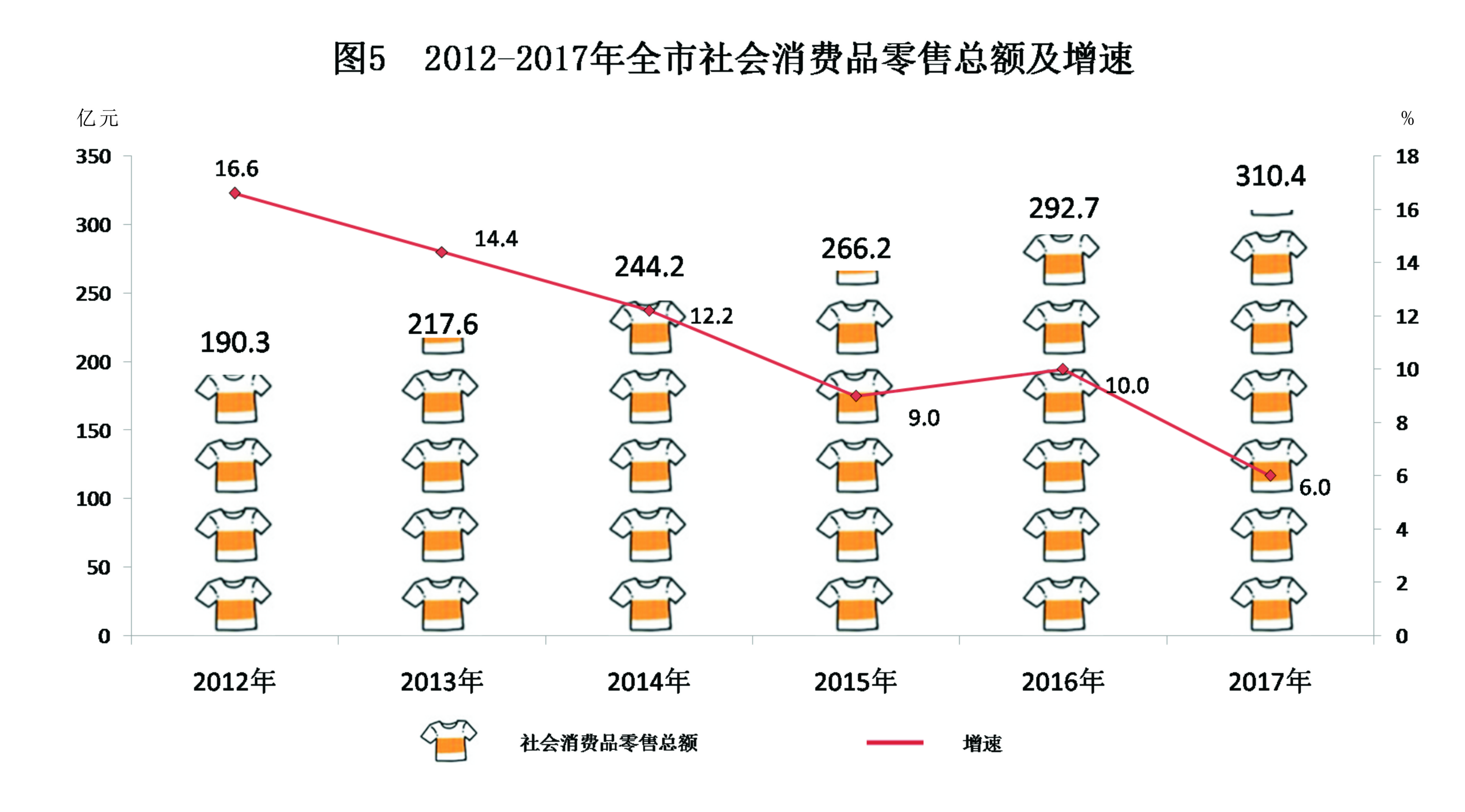 市场销售态势良好。全年实现社会消费品零售总额310.38亿元,比上年增长6.0%。其中,全市实现城镇消费品零售额277.78亿元,增长5.9%,占社会消费品零售总额的89.5%;乡村实现零售额32.6亿元,增长6.8%。批发业实现销售额127.1亿元,增长10.0%;零售业实现销售额348亿元,增长5.4%;住宿业实现营业额11.9亿元,增长5.5%;餐饮业实现营业额93.7亿元,增长7.6%