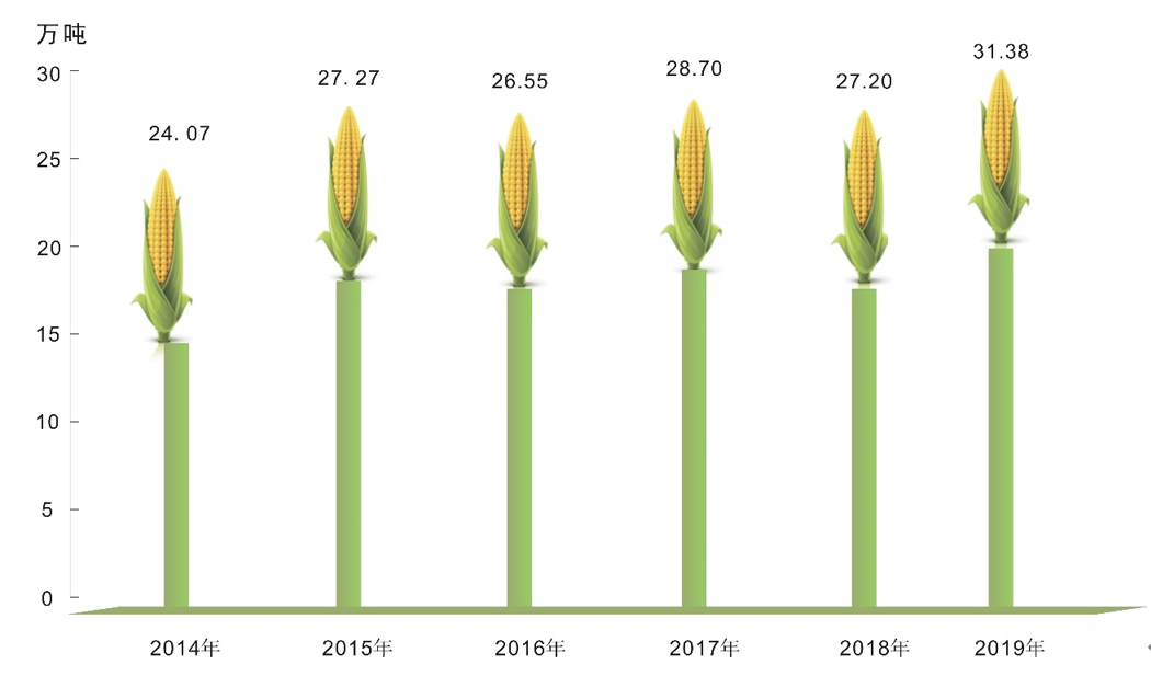 全市粮食总产量31.38吨,比上年增产15.5%。其中,玉米产量25吨,增产11.3%,单产6358.71公斤/公顷,增长8.6%;水稻产量0.51吨,减少2.9%,单产7122.22公斤/公顷,增长6.1%