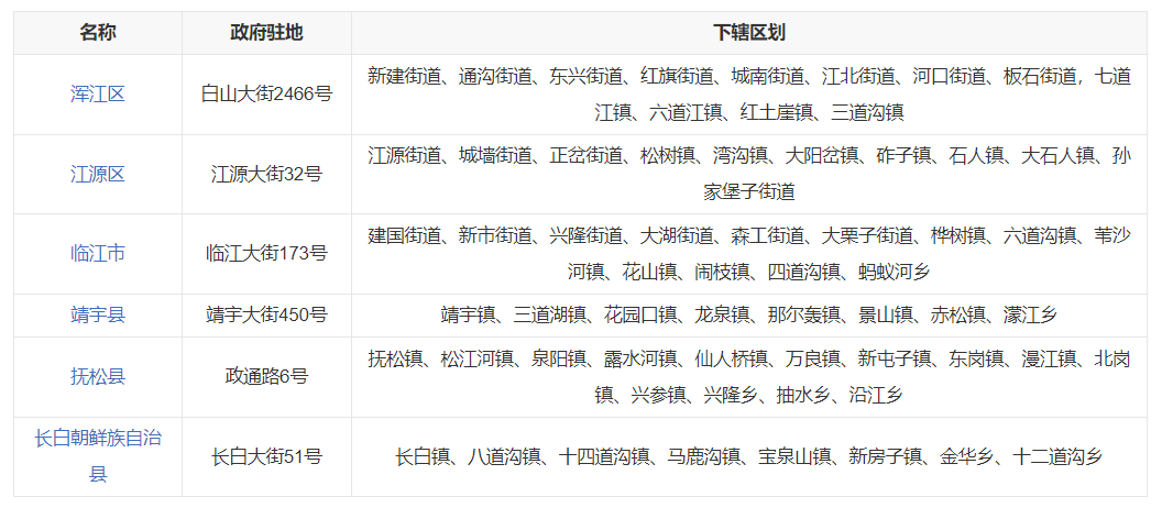 白山市共辖2个区、2个县、1个自治县,代管1个县级市,分别是浑江区、江源区、临江市、靖宇县、抚松县、长白朝鲜族自治县。